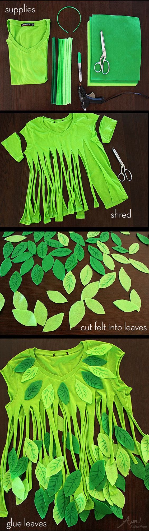 A póló alját mellrészig vágjuk csíkokra.A kétféle zöld filcből vágjunk ki levélformákat, amikre filctollal rajzoljuk fel az ereket. Majd fogjuk a ragasztót és ragasszuk rá a pólóra a leveleket tetszőleges elrendezésben, kerüljön levél minden csík aljára is. A fejpántot is filccel a legegyszerűbb megoldani, egy sima műanyag hajpántra ragasszuk rá a zöld filcet és a leveleket.