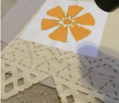 A szoknyához vagdosd be a barna szoknya alját 1 centinként, hogy rojtos legyen az alja. A fehér anyagra/terítőre pedig, szintén textilfilccel, rajzolj sárga virágokat.