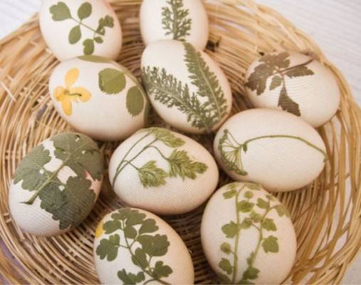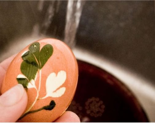 - Virágok, fűszernövények leveleit (gyermekláncfű, ibolya, petrezselyem) a tojásra illesztjük, majd harisnyadarabbal szorítjuk rá, és rákötözzük. A levél alatt megmarad a tojás eredeti színe, ott nem fogja be a színezőlé.Ez a technika a berzselés.